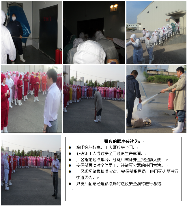熟食二廠全體員工332人,于2013061616:40分,在熟食廠副總經理徐恩峰、公司安保部劉龍軍的指揮下,進行了一次以“緊急事故發生時熟悉疏散路線、提高疏散速度、減少人員傷害“為目的的模擬安全演練。