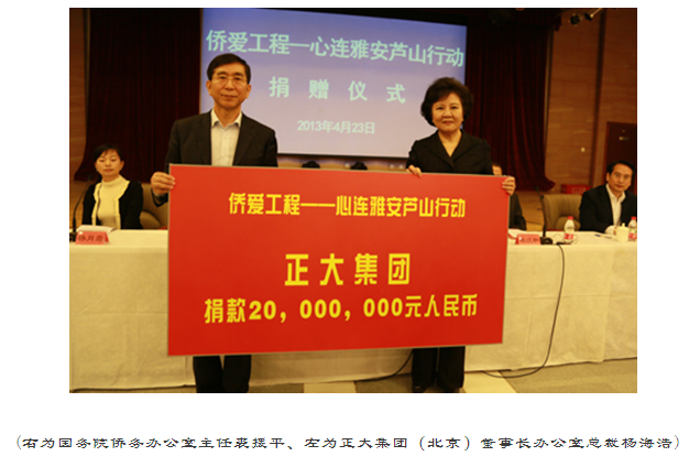 2013年4月20日8時(shí)02分,四川省雅安市蘆山縣發(fā)生7.0級(jí)地震。消息傳來(lái),舉國(guó)震動(dòng)。中國(guó)人民心連心,一方有難八方支援,全國(guó)人民與雅安人民站在一起。社會(huì)各界紛紛伸出了援助之手,對(duì)災(zāi)區(qū)進(jìn)行了各種形式的捐助、支持與幫助。4月23日,正大集團(tuán)為雅安地震災(zāi)區(qū)捐款人民幣2000萬(wàn)元,集團(tuán)(北京)董事長(zhǎng)辦公室楊海浩總裁代表集團(tuán)出席國(guó)務(wù)院僑辦舉行的“僑愛(ài)工程——心連雅安蘆山”行動(dòng)捐贈(zèng)儀式。